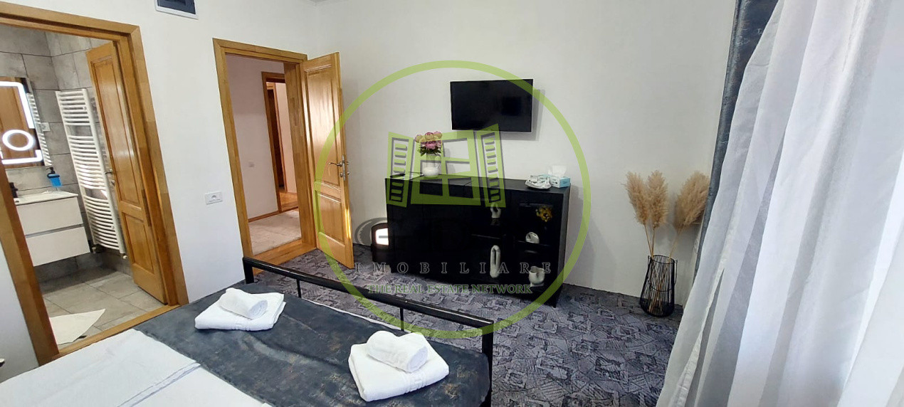 - 3 dormitoare generoase , fiecare dotat cu pat matrimonial , dressing pentru depozitare, noptiere, comoda, frigider, aer conditionat, televizor si fiecare are baie proprie cu cabina de dus si geam pentru aerisire.