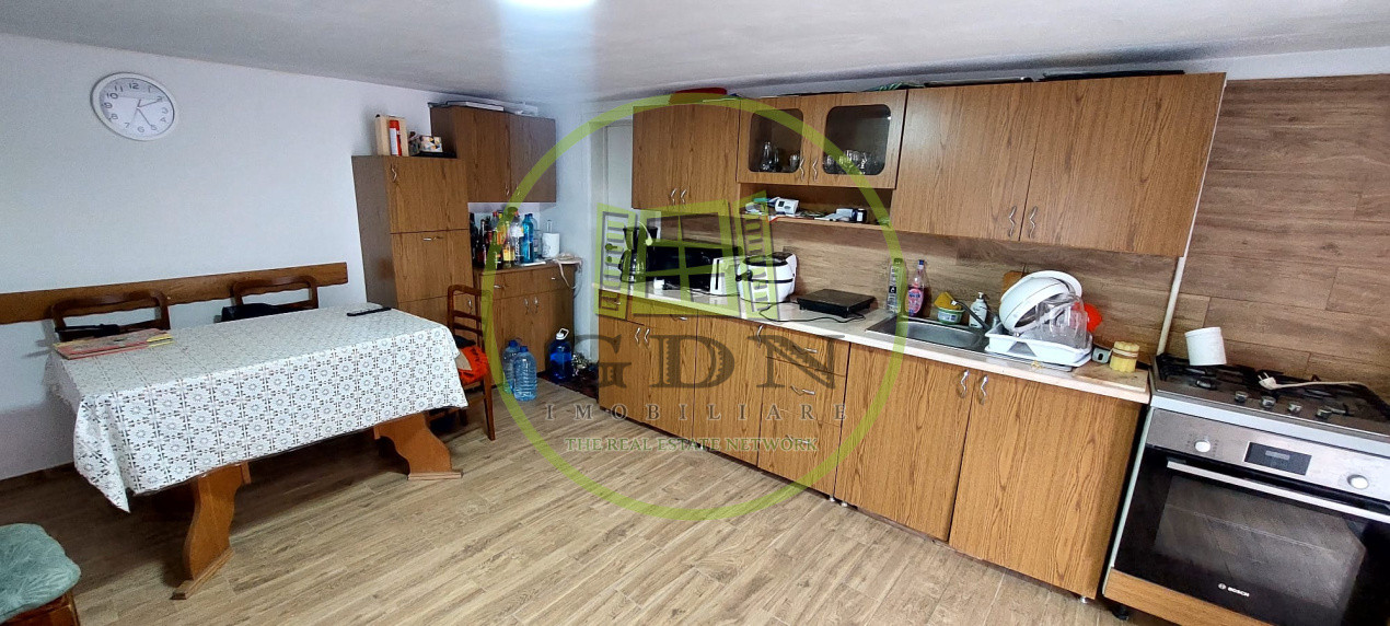 La parter avem o bucatarie complet mobilata si utilata, o pivnita de 20mp, Un living de 40mp dotat cu soba de teracota , coltar si zona de dinning, cu 2 grupuri sanitare cu geam de aerisire.