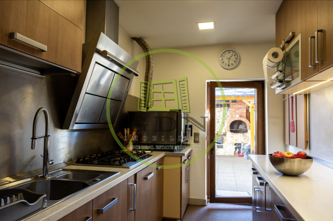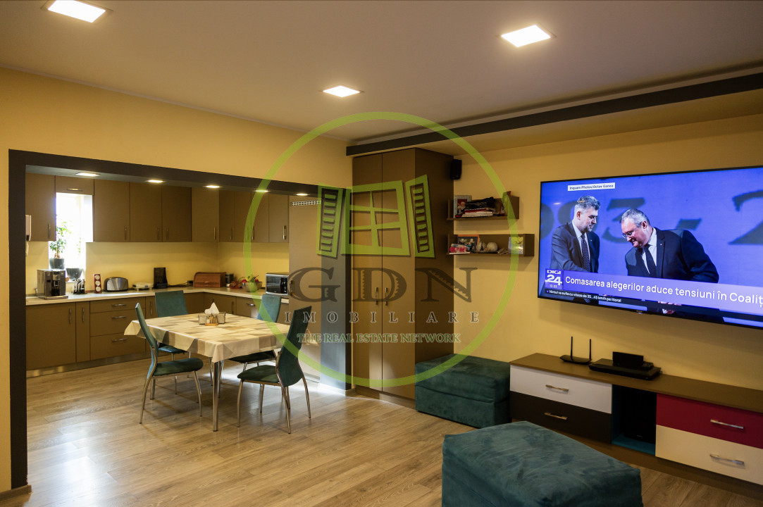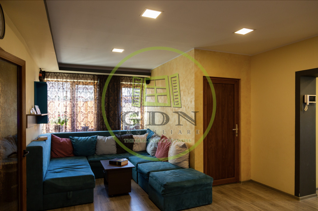Hol cu scari acces mansarda inalta, pivnita, un living cu dinning, baie si bucatarie, toate mobilate.
