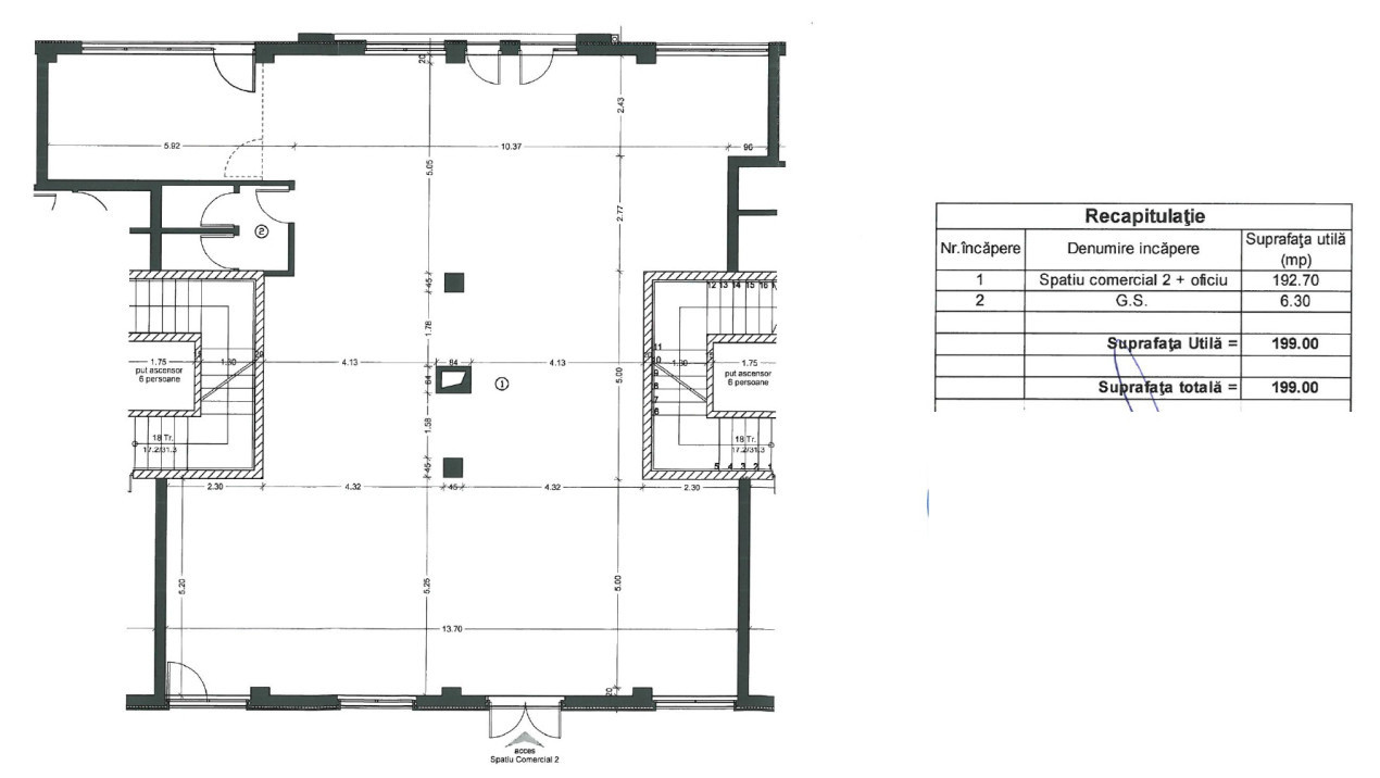 Proprietatea are o suprafață utilă totală de 199 mp, fiind împărțite astfel: spațiu open-space, grup sanitar. Momentan este compartimentat, însă există posibilitatea de recompartimentare interioară după preferințe.