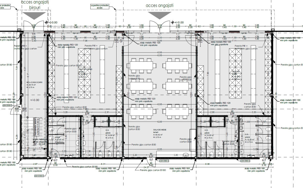 - parter: sală de mese, 2 vestiare, femei+ bărbați, grupuri sanitare, hol, casa scării - 265 mp