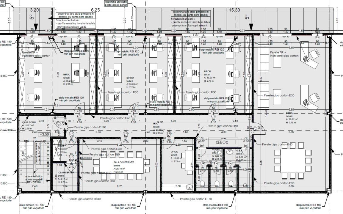 - Etaj 2 : sală de conferințe, 4 birouri, oficiu, IDSA/server, 2 grupuri sanitare, hol, casa scării - 274 mp